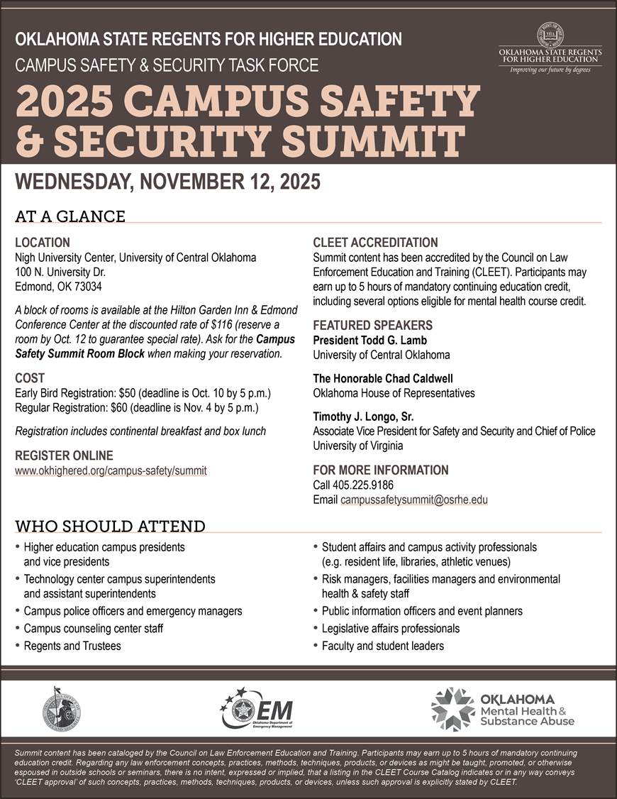 Please join us Wednesday, November 12, 2025 for the Campus Safety & Security Summit, hosted by the Oklahoma State Regents for Higher Education’s Campus Safety & Security Task Force in partnership with the Oklahoma Department of Emergency Management, Oklahoma Office of Homeland Security and Oklahoma Department of Mental Health and Substance Abuse Services.