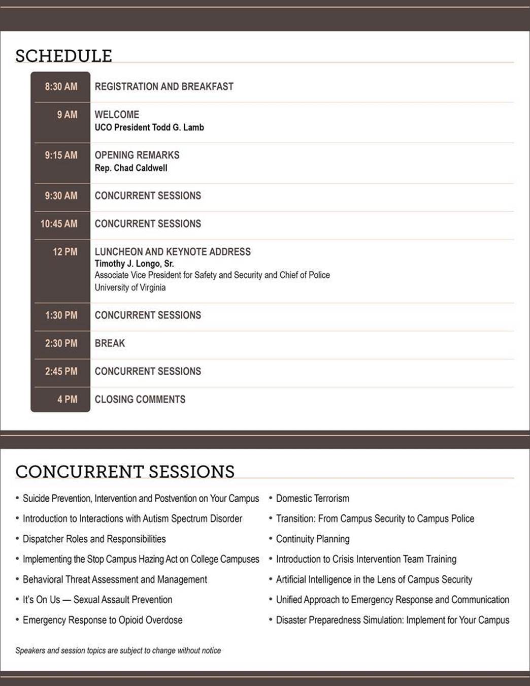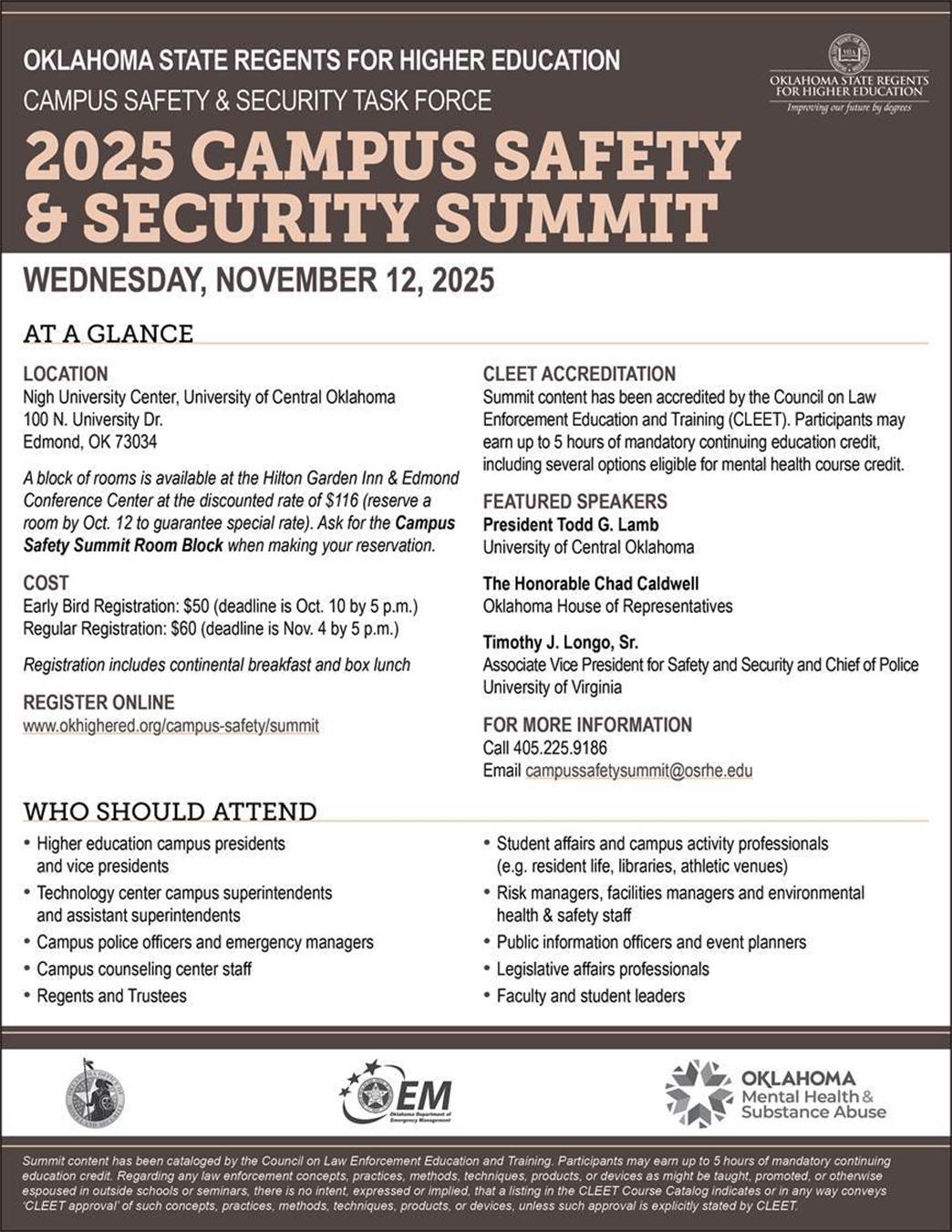 Join us Wednesday, November 12, 2025 for the Campus Safety & Security Summit, hosted by the Oklahoma State Regents for Higher Education’s Campus Safety & Security Task Force in partnership with the Oklahoma Department of Emergency Management, Oklahoma Office of Homeland Security and Oklahoma Department of Mental Health and Substance Abuse Services.