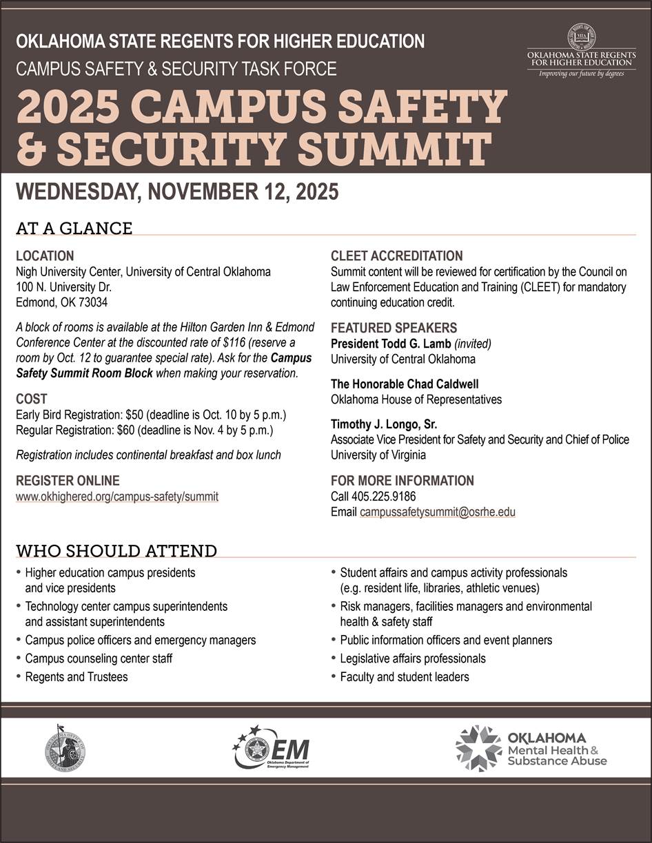 Please join us Wednesday, November 12, 2025 for the Campus Safety & Security Summit, hosted by the Oklahoma State Regents for Higher Education's Campus Safety & Security Task Force in partnership with the Oklahoma Department of Emergency Management, Oklahoma Office of Homeland Security and Oklahoma Department of Mental Health and Substance Abuse Services.