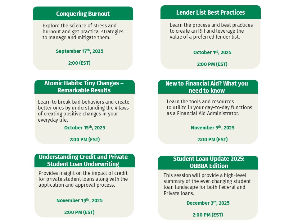 We’ve planned this series of engaging sessions to help you and your team stay informed on financial aid updates, grow professionally, and even take a moment for some well-deserved self-care.
