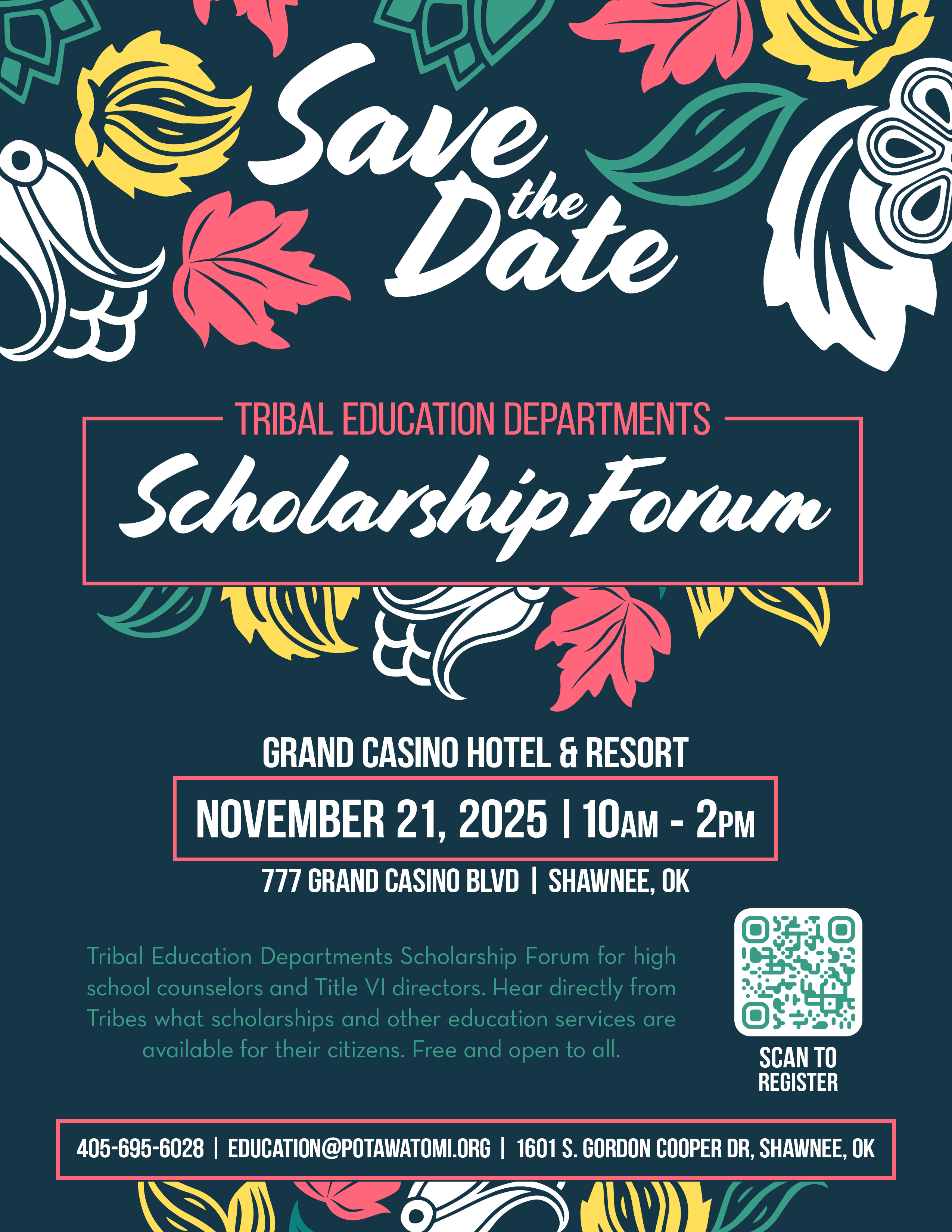 The Citizen Potawatomi Nation Department of Education is happy to announce registration for the annual Tribal Education Department (TED) Forum is now open! The event will be held on November 21st at the Grand Casino Hotel and Resort in Shawnee. Please use the QR code on the attached flyer or visit https://www.potawatomi.org/ted-forum/ to register. Lunch will be provided for all counselors in attendance. Please come learn information on educational services provided by tribes in Oklahoma as they will give brief presentations about their services and will be available to answer questions after lunch in a college fair type setting. If you have any questions regarding this event, please contact Kelley Johnson at kelley.johnson at potawatomi.org<mailto:kelley.johnson at potawatomi.org> or 405-695-6028.